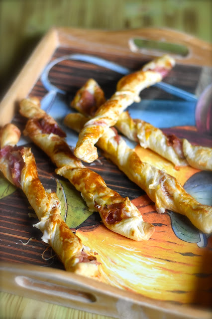 Adagiamo la raspadura e il prosciutto a pezzetti sulla lunghezza delle strisce di pasta sfoglia.