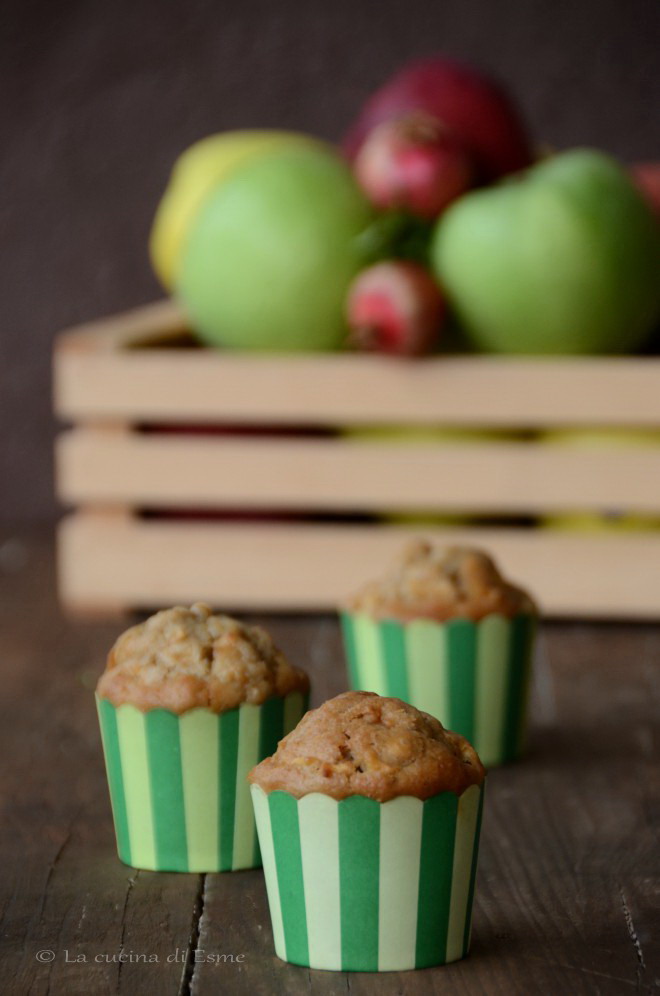 Lavate e sbucciate le mele, riducetele in piccola dadolata, mettete in una ciotola, condite con una spruzzata di limone, aggiungete abbondante cannella in polvere, mescolate bene, coprite con della pellicola e lasciate da parte. Come sempre per i muffin separate gli ingredienti secchi da quelli liquidi. In una ciotola mettete le farine setacciate, il lievito, il bicarbonato e lo zucchero e mescolate con una forchetta, in un’altra ciotola unite l’uovo leggermente battuto, l’olio ed il latte. Unite gli ingredienti liquidi a quelli secchi, date una semplice mescolata con una forchetta e poi aggiungete all’impasto la dadolata di mele. Mescolate delicatamente con l’aiuto di una spatola in silicone e poi versate il composto nei pirottini fino a riempirli per ¾, infornate in modalità areata a 180° per 25 minuti. Una volta raffreddati serviteli, semplici oppure con una spolverata di cannella. Questi muffin sono molto soffici e umidi al punto giusto, e conservati sotto la classica campana di vetro risultano perfetti per due o tre giorni.