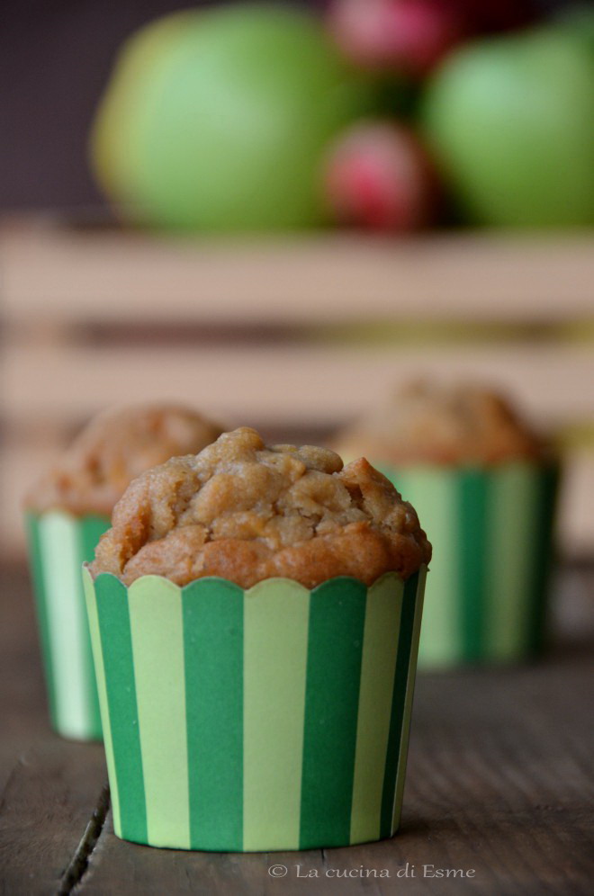 Lavate e sbucciate le mele, riducetele in piccola dadolata, mettete in una ciotola, condite con una spruzzata di limone, aggiungete abbondante cannella in polvere, mescolate bene, coprite con della pellicola e lasciate da parte. Come sempre per i muffin separate gli ingredienti secchi da quelli liquidi. In una ciotola mettete le farine setacciate, il lievito, il bicarbonato e lo zucchero e mescolate con una forchetta, in un’altra ciotola unite l’uovo leggermente battuto, l’olio ed il latte. Unite gli ingredienti liquidi a quelli secchi, date una semplice mescolata con una forchetta e poi aggiungete all’impasto la dadolata di mele. Mescolate delicatamente con l’aiuto di una spatola in silicone e poi versate il composto nei pirottini fino a riempirli per ¾, infornate in modalità areata a 180° per 25 minuti. Una volta raffreddati serviteli, semplici oppure con una spolverata di cannella. Questi muffin sono molto soffici e umidi al punto giusto, e conservati sotto la classica campana di vetro risultano perfetti per due o tre giorni.