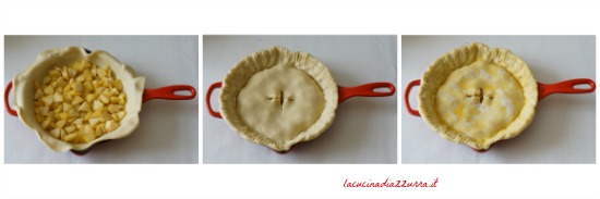 - Dividila in due parti uguali, stendi la prima e mettila in una teglia (o padella) di 20-22cm, adagia le mele e ricopri col secondo disco steso