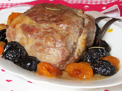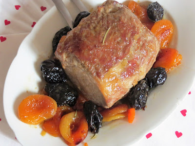 Irrorate le fette di carne con la salsa di prugne e albicocche, bollente e servite subito.
