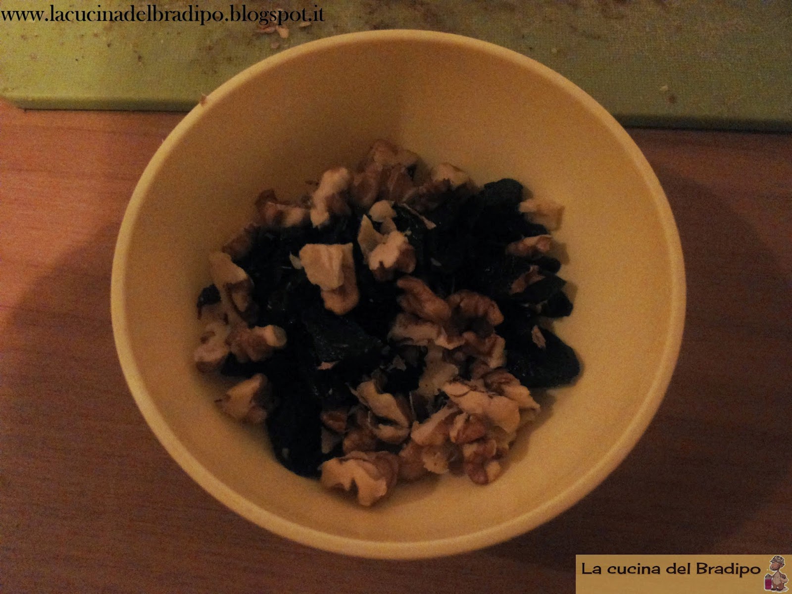 Farcire la carne con uno strato di speck, dopodichè aggiungere le prugne e le noci tagliate a pezzi: