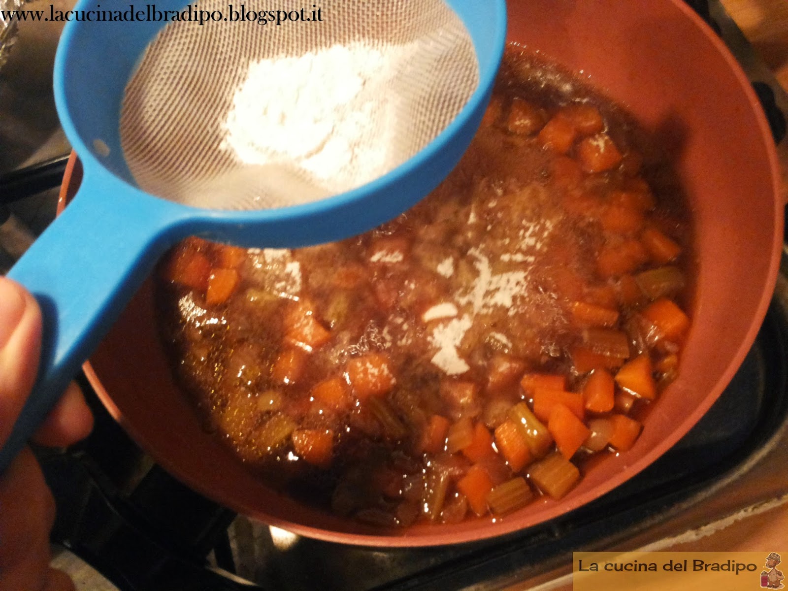 Tagliare le verdure a pezzi grossolani e soffriggerle in una casseruola con dell’olio evo, successivamente aggiungere la carne e lasciala rosolare su tutti i lati: