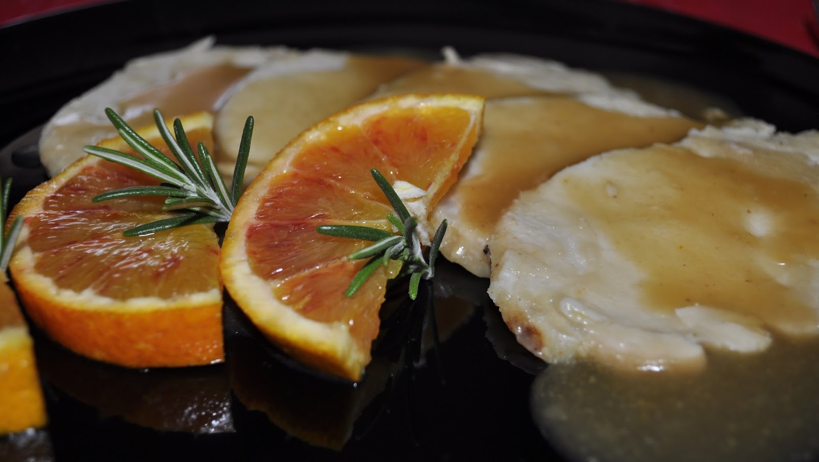 Versate il succo nel fondo di cottura e fate sobbollire. Se la densità vi sembra troppo liquida potete aggiungere un cucchiaino di farina che la farà addensare. Filtrate il tutto. La salsa insaporirà il vostro arrosto tagliato a fette sottili. Potete completare il piatto con fette d’arancia e ciuffetti di rosmarino.