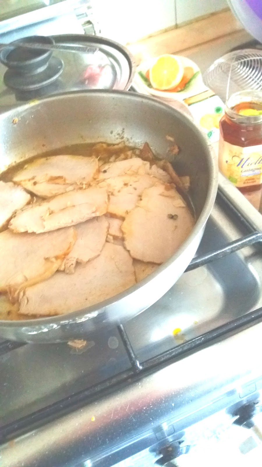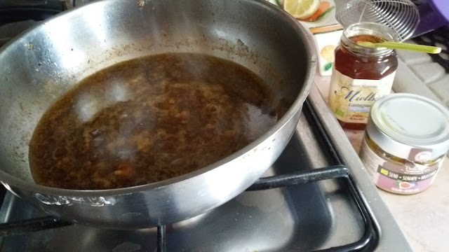 Nel sugo rimasto aggiungere ora,la fecola ed il miele ,mescolare facendo attenzione a sciogliere il tutto, rimettere nel sugo le fettine,farle insaporire e servire.