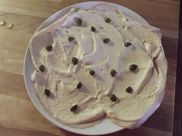 Sistemate le fettine di arrosto di tacchino su un piatto, nel frattempo preparate la maionese senza uova seguendo il procedimento qui,dovete poi arricchirla con il tonno e i capperi sempre con il frullatore, spalmatela sopra e decorate con capperi.