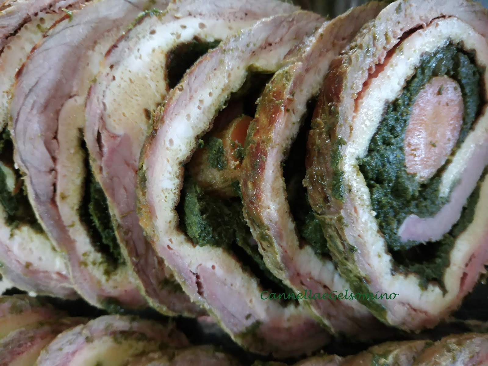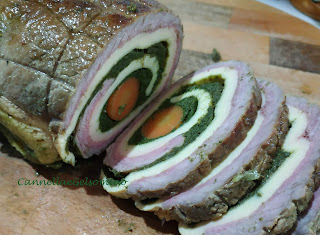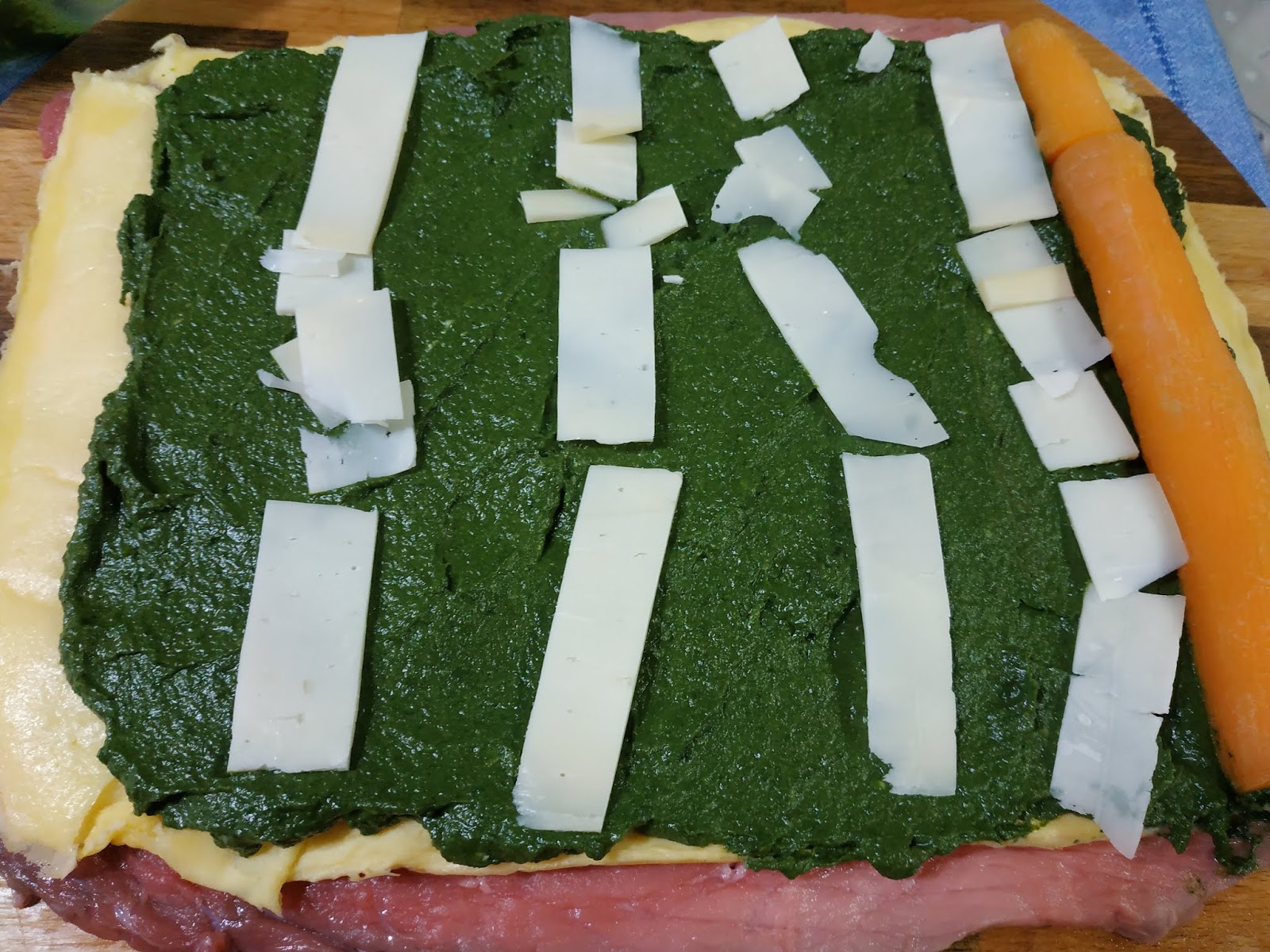Come ingredienti per questo arrotolato vi serviranno: una larga fetta di fesa di vitello (essere serviti da un macellaio bravo è già sicurezza di riuscita) per il peso calcolate 1 etto per persona più o meno; spinaci freschi 500 g, 3 uova, 100 g di parmigiano grattugiato, una o due carote sbollentate, fettine di provola dolce, sale, pepe, noce moscata, olio extravergine d’oliva.