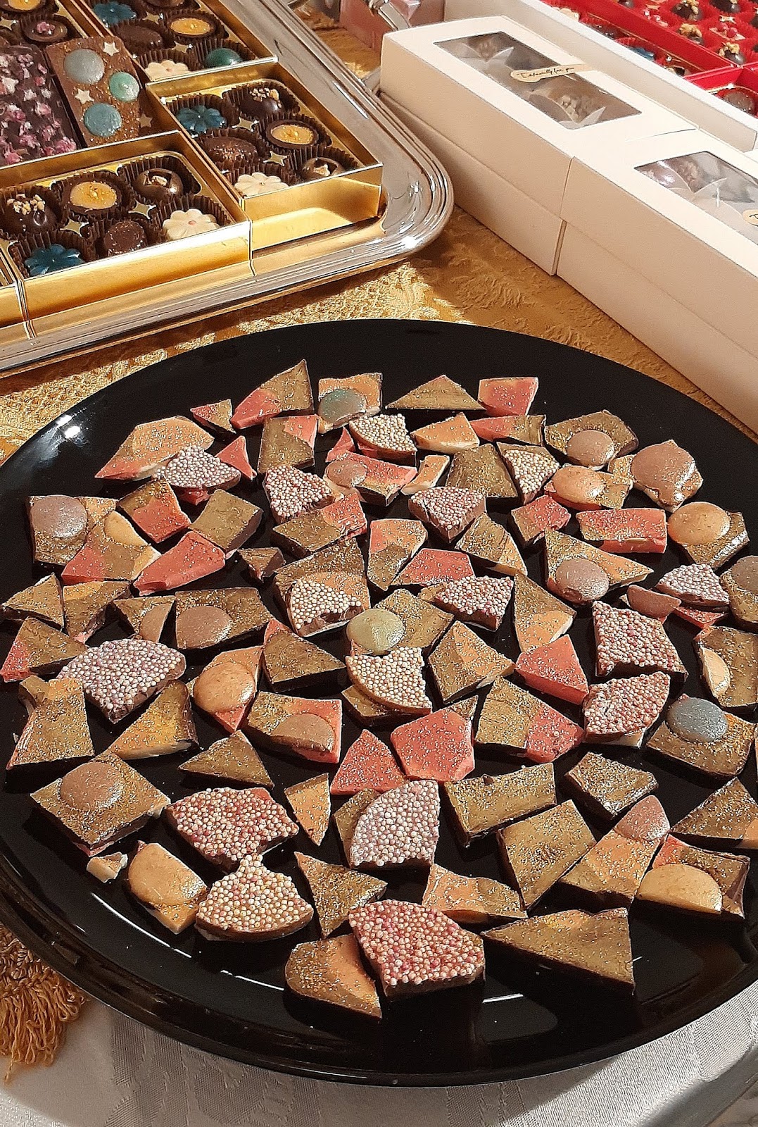 Tra fiori e dolci pietre preziose incastonate in tavolette di cioccolato, stupiscono gli artistici mosaici di cioccolato bianco, fragranti e delicati.