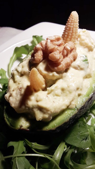 Unire le noci tritate serbando due per la decorazione dei due mezzi avocados..