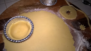 Stendo con il mattarello e ritaglio dei dischi per foderare degli stampini di alluminio. Ritaglio dei dischi più piccoli che fungeranno da coperchietto.