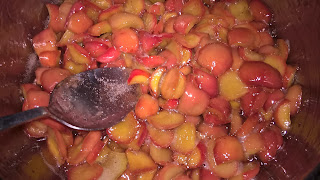 Le peso e aggiungo lo zucchero (in 400 g di frutta ho messo 100 g di zucchero) e un cucchiaino di cannella. Spremo mezzo limone e metto sul fuoco mescolando per non fare attaccare.