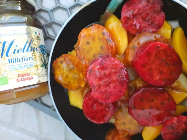 Sbucciare e tagliare la frutta a ns piacimento,metterla in un tegamino con qualche cucchiaio di miele