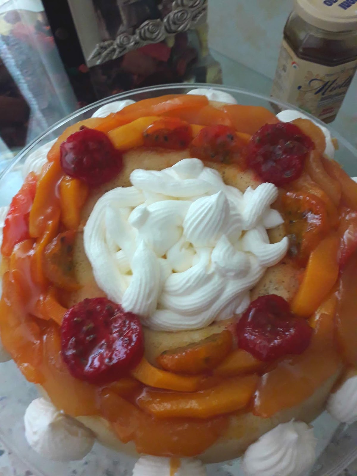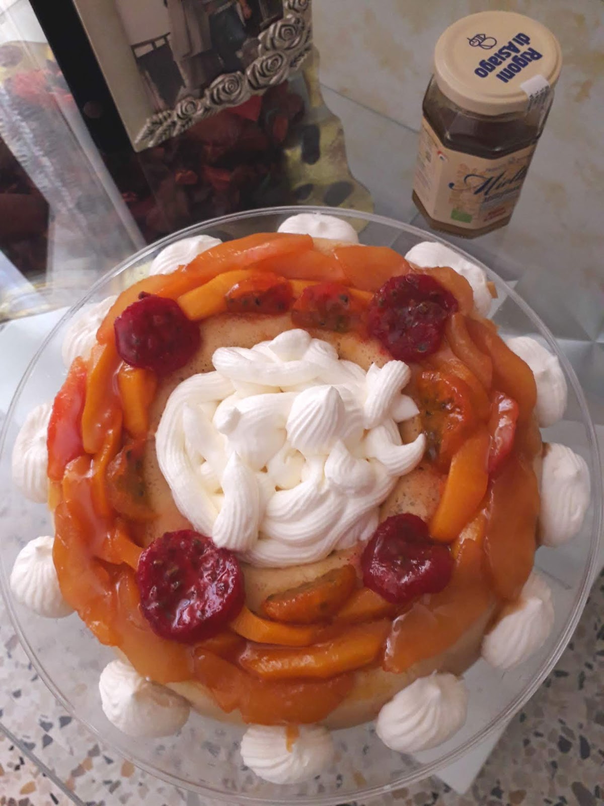 decorare con la frutta caramellata e ciuffi di panna montata!!