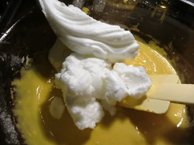 Con una spatola aggiungere poco per volta gli albumi, mescolando delicatamente dal basso verso l’alto..