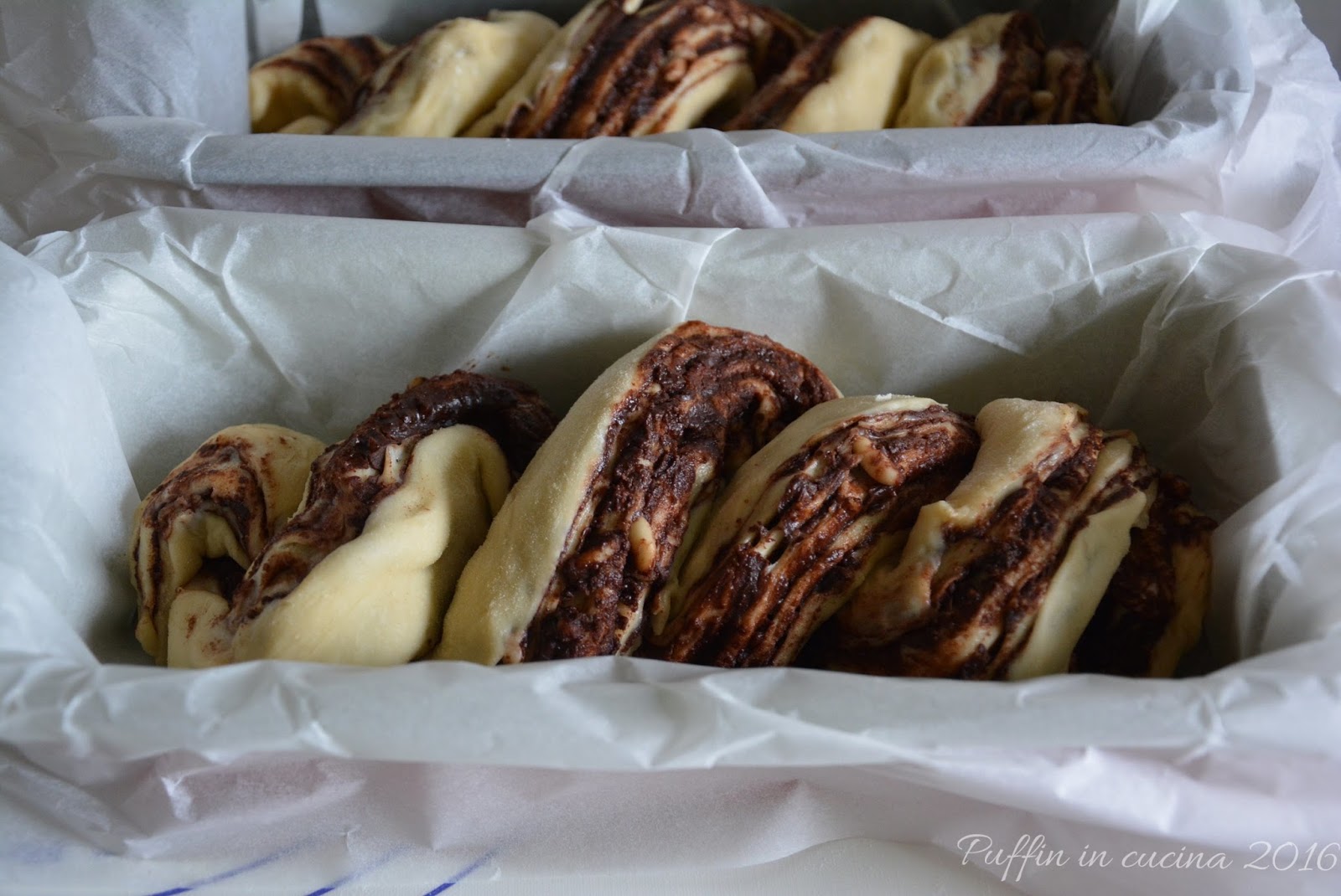 Riprendere l’impasto, divideterlo a metà e stendere una metà in un rettangolo di circa 30x40cm. Spalmarlo con metà della crema di cioccolato, cospargere con 1 cucchiaio di zucchero e metà dei pinoli. Arrotolare dal lato più lungo e poi tagliare in due il rotolo.