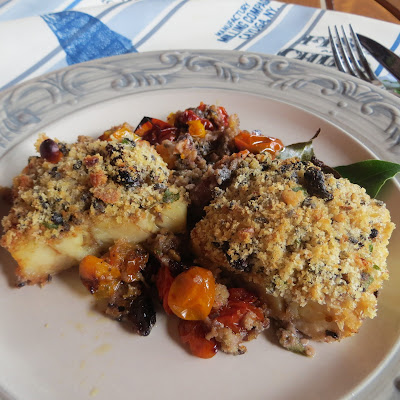 Cospargete con olio E.V.O. una teglia e adagiatevi le foglie d’alloro, quindi coprite la teglia con la metà del trito, sistemate sopra al trito il baccalà, e intorno tutti i pomodorini tagliati a metà.