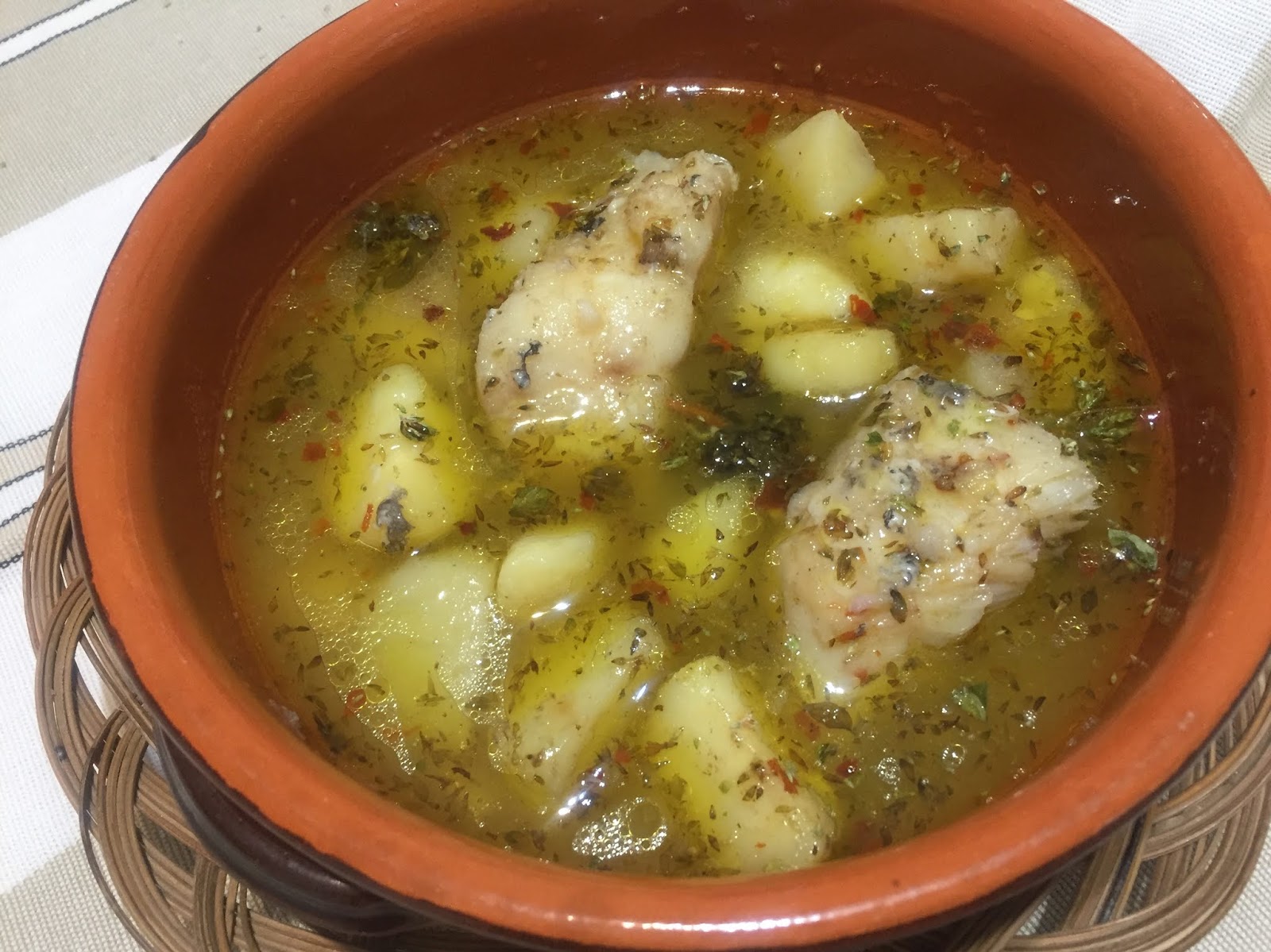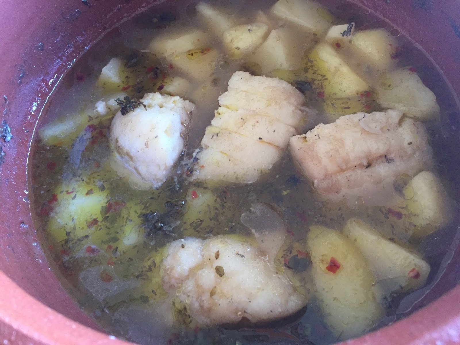 In una pentola di coccio oppure in un tegame versate in abbondante acqua l’olio evo, un pizzico di sale, l’origano, l’aglio. Fate bollire il tutto per circa 30 minuti e poi aggiungere il baccalà e le patate.