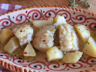 Dividete il baccalà a pezzi e tagliate le patate a spicchi grossi.