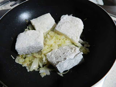 In una padella capiente mettere due cucchiai di olio evo e le cipolle affettate, lasciare stufare le cipolle dolcemente senza farle colorare troppo. Intanto infarinare i pezzi di baccalà
