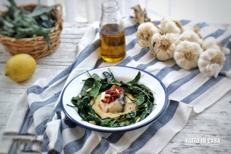 E per la vigilia di Capodanno, per l'emozione di avere qualche parente in più a casa, ho voluto preparare qualcosa di speciale. A parte il classico aperitivo, bello ricco di tutti i piatti della nostra tradizione campana, un primo piatto di pesce, ho concluso la serata con un baccalà davvero speciale, cotto a bassa temperatura e servito con una crema di ceci e delle verdure salate. Io ho scelto i broccoli neri di Natale, ma potete tranquillamente usare delle cicorie o del cavolo nero.