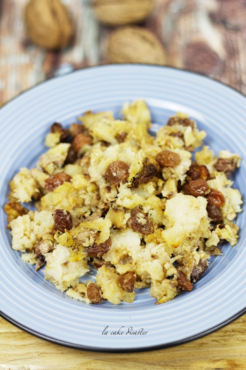 Iniziamo preparando il baccalà, io compro quello già bagnato è più comodo e semplice da lavorare, si tolgono le lische, la pelle e si taglia a pezzettini molto piccoli. In una insalatiera mettiamo il baccalà a pezzetti, le noci a pezzettini, la mollica di pane, il parmigiano e l’uvetta strizzata bene (precedentemente tenuta a mollo per qualche minuto), mescolare bene tutti gli ingredienti e poi mettere il composto in una teglia da forno antiaderente, condire con abbondante olio, mescolare, infornare e far cuocere a 180° per 30/40 minuti (ricordate sempre che la temperatura ed i minuti di cottura variano sempre da forno a forno, in questo caso ho usato un forno a gas). Sfornare e servire caldo.