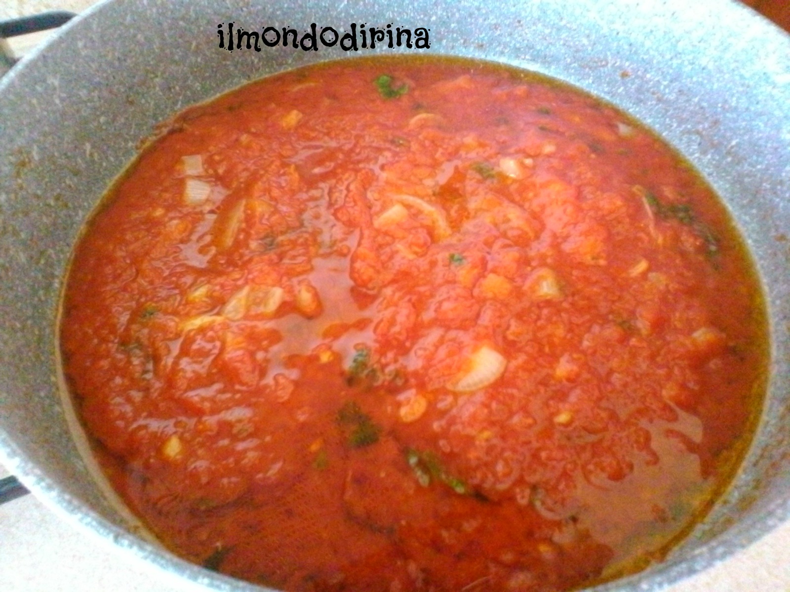In un’altra padella versate dell’olio evo, i cipollotti affettati sottilmente, il peperoncino e lo spicchio d’aglio, soffriggete e poi unite la polpa di pomodoro. Salate pochissimo, aggiungete del prezzemolo tritato e fate cuocere per 10 minuti circa.