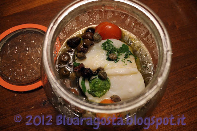 Non ho messo sale perché avevo il baccalà dissalato e le olive e ho preferito assaggiare a fine cottura. Un vasetto alla volta ben chiuso con le clips, microonde a 800 WATT, 5 o 6 minuti. Togliamo il vasetto con dei guanti da forno e appoggiamolo da parte. Continuerà a bollire ancora, noi lasciamolo lì… fino al momento di servirlo. Siccome rimane bollente per parecchio tempo, possiamo anche prepararlo con qualche mezz’ora di anticipo. Daremo poi a ogni commensale un vasetto, che avrà ovviamente fatto il vuoto. Basterà tirare la guarnizione dalla linguetta, e aprire il coperchio… poi sui profumi e sul sapore ce lo sappiamo dire!