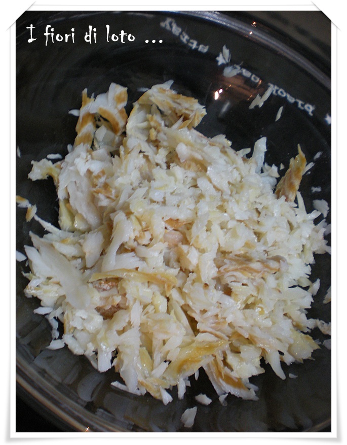 Trasferite il baccalà in una terrina con una schiumaiola senza buttare l’acqua di cottura, pulirlo dalla pelle e dalle spine, ridurre la polpa in piccoli pezzi.