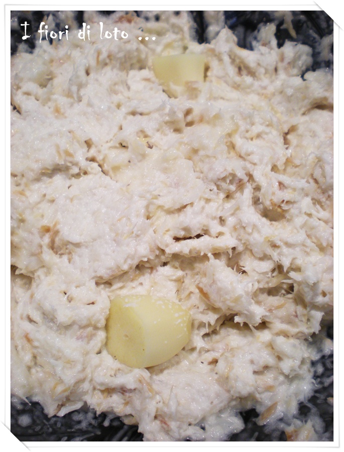 In un una terrina abbastanza capiente mettere il baccalà, 3.-4 cucchiai dell’acqua di cottura, sale a piacere e cominciare a “montarlo” con un cucchiaio di legno.