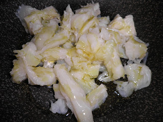 Mettete 400 g di baccalà dissalato e pulito da pelle e lische, in una padella con tre cucchiai di olio extravergine d’oliva. Fate cuocere con il coperchio per 5 minuti.