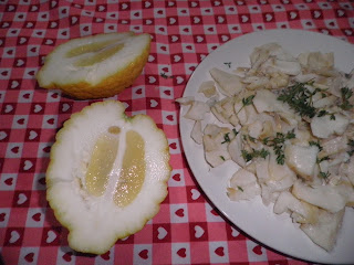 Il baccalà in insalata è tipico della mia provincia: anche d’inverno noi lo mangiamo così, semplicemente bollito, poi diliscato e condito con olio extravergine di oliva, limone, aglio, prezzemolo e peperoncino. Nient’altro. Ho provato il connubio con il cedro, il nostro “pirettu” e il risultato è davvero notevole.