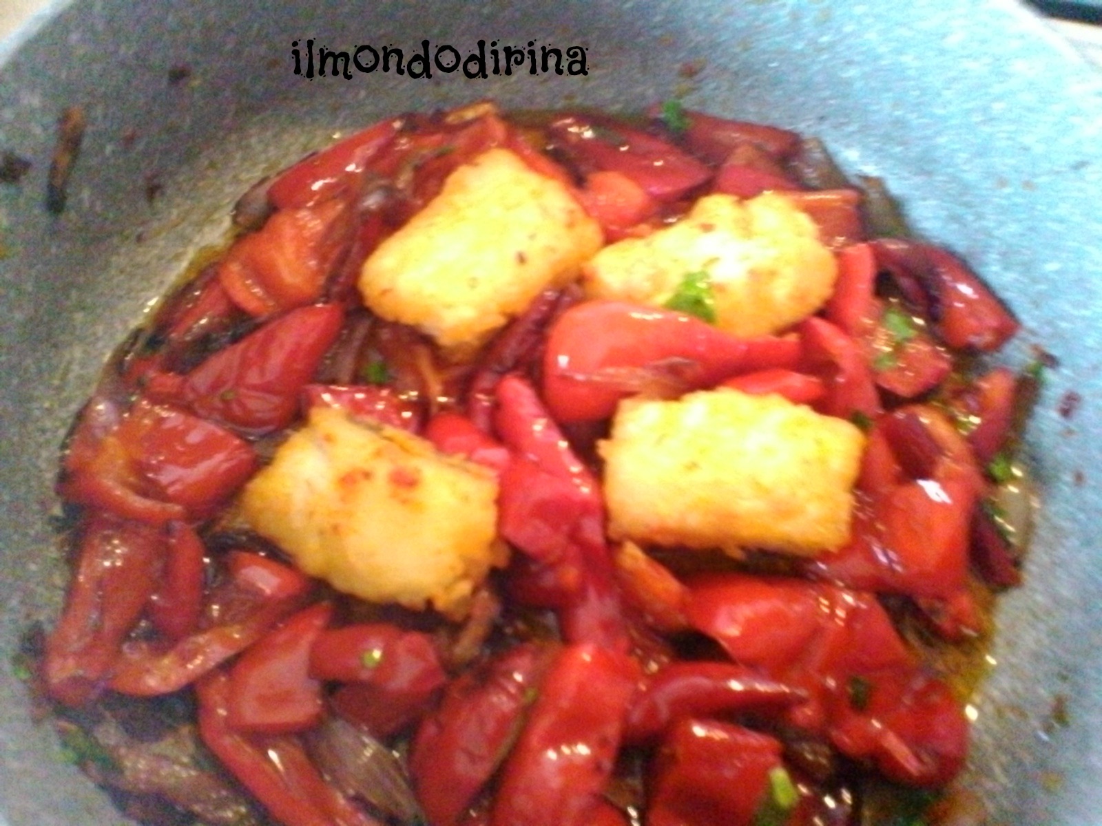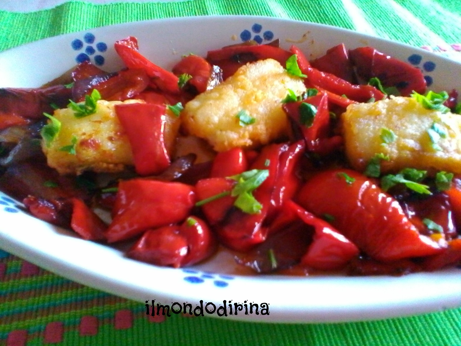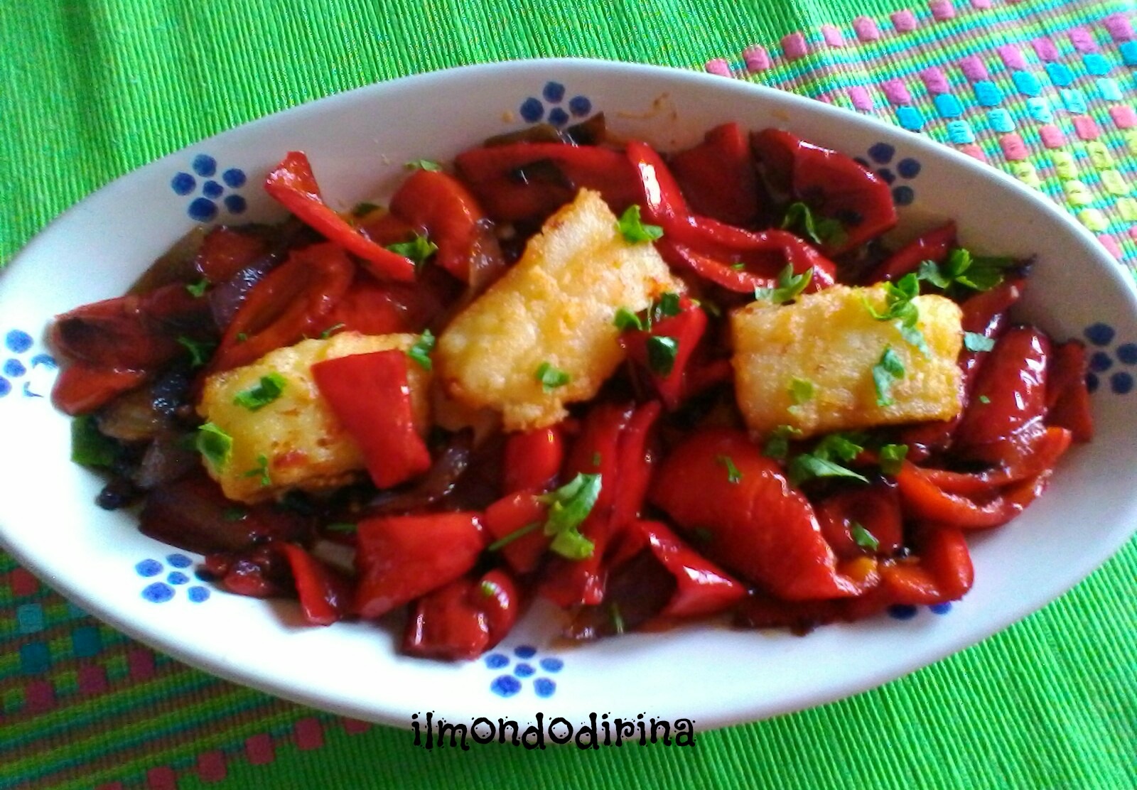 Pulite la cipolla e tagliatela a spicchi; lavate e pulite i peperoni togliendo peduncolo e semi interni, poi tagliateli a listarelle e salateli leggermente. Friggete peperoni e cipolla nello stesso olio del baccalà, prima a fiamma vivace e poi a fiamma bassa e coperti.
