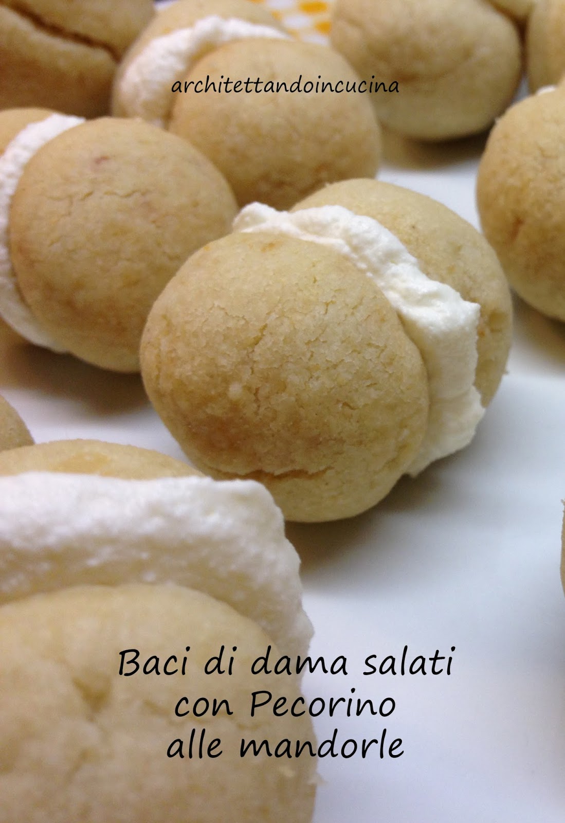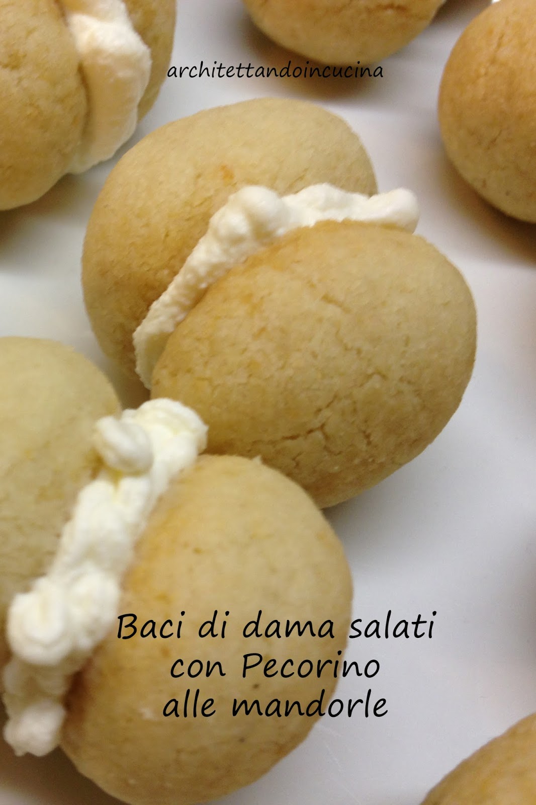 I baci di dama sono biscotti, ovviamente dolci, originari della città di Tortona, qui li ho presentati salati: buonissimi biscotti di frolla salata, ripieni di una morbida crema di ricotta. Con un Franciacorta o champagne è “la morte sua” nasce un aperitivo gustoso che si presenta benissimo. Questi baci di dama sono realizzati con il Pecorino alle Mandorle nell’impasto che rinforza il sapore di mandorla dei biscotti ed una crema di ricotta come farcia, per dare freschezza e morbidezza.
