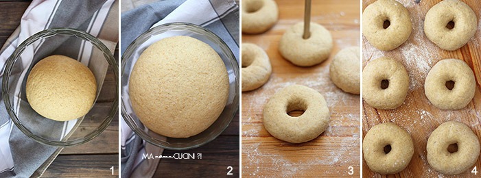 Create un buco al centro aiutandovi con il manico di un cucchiaio di legno (foto 3) e allargatelo tirando con le dita, coprite con un panno e fate lievitare in un luogo caldo per 30 minuti o fino a quando i bagels non saranno belli gonfi (foto4).