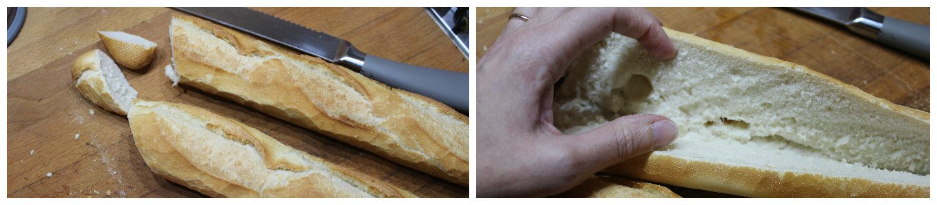 Con un coltello seghettato da pane, taglite la baguette a metà, con un taglio obliquo e allo stesso modo tagliate via le due estremità.