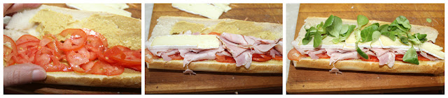 Spalmate l’interno del pane con della senape a piacere, sistemate sulla parte bassa del panino metà delle fette di pomodoro condite con un pizzico di sale; sopra 2 fette di prosciutto e metà del brie, concludete con qualche ciuffo di soncino. Richiudete il pane e avvolgete la baguette in un tovagliolo di carta, vi aiuterà a mangiare il panino “in sicurezza”, evitando di sbrodolarvi. Procedete allo stesso modo con l’altra mezza baguette.