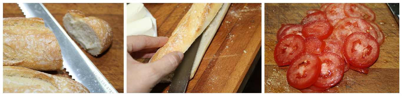 Per prima cosa aprite la busta di salmone per farlo respirare, spuntate l’estremità della baguette e tagliatela metà, se riuscite fate i tagli obliqui, il sapore non cambia ma il panino sarà più bello.
