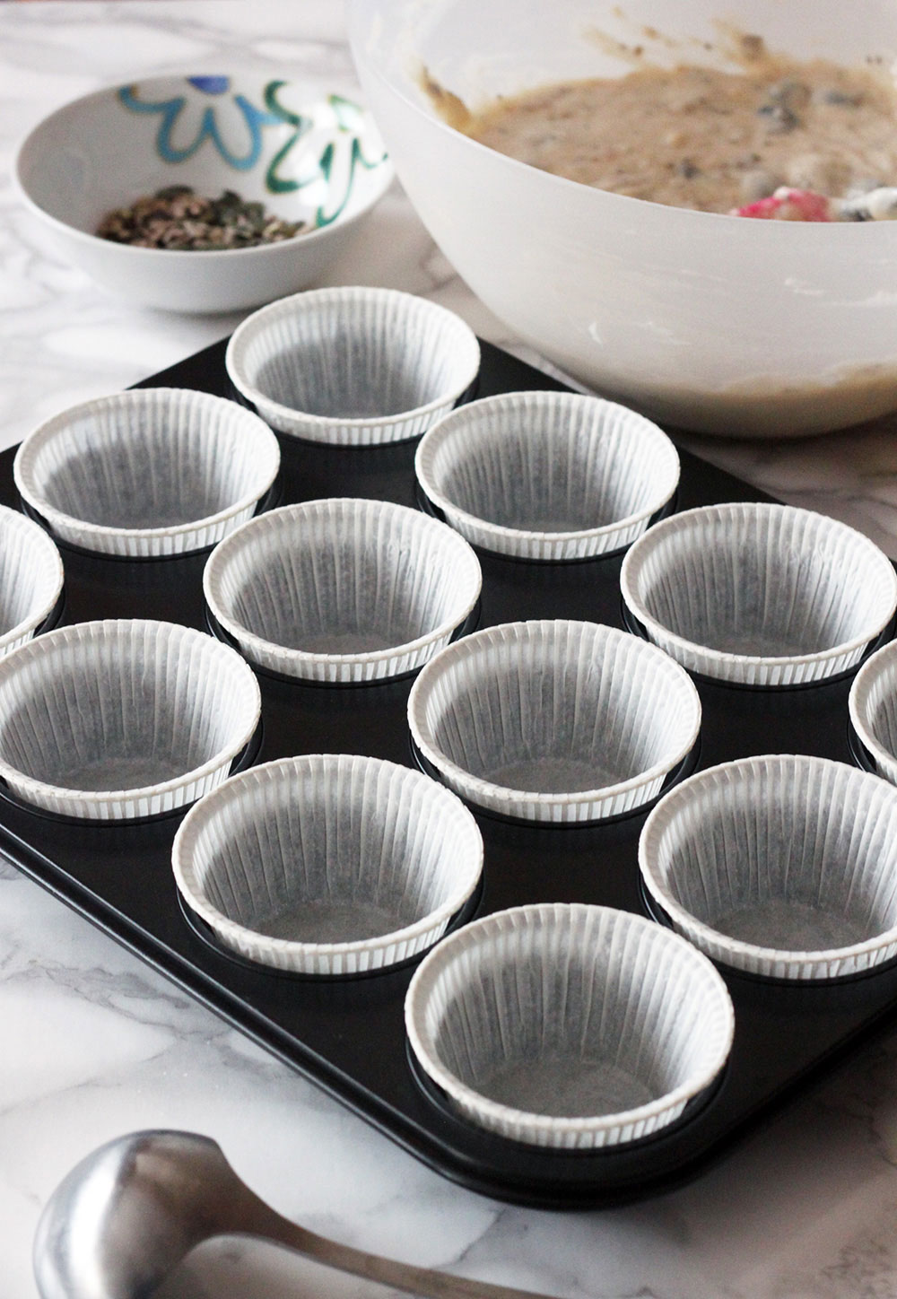 Español – Rellenar los moldes de papel para magdalenas o muffins en tres cuartas partes de su capacidad. Decorar la parte superior de cada magdalena con un poco de semillas.