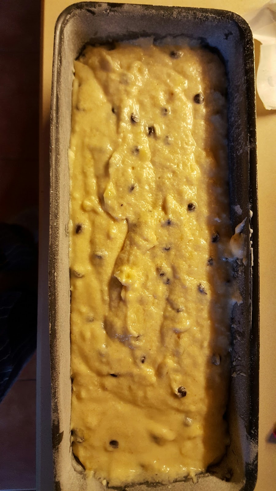 Mischiare tutto per bene, imburrare e infarinare uno stampo da plum cake e versarci dentro il composto