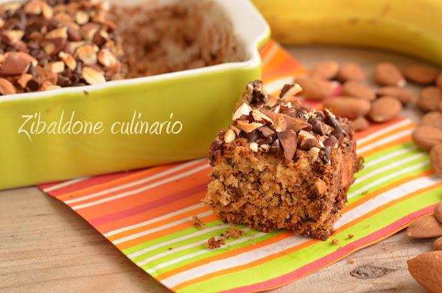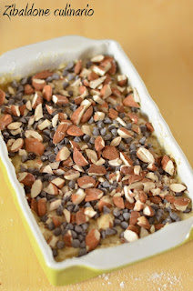 Livellare la superficie e cospargerla con le gocce di cioccolato e le mandorle tritate grossolanamente.