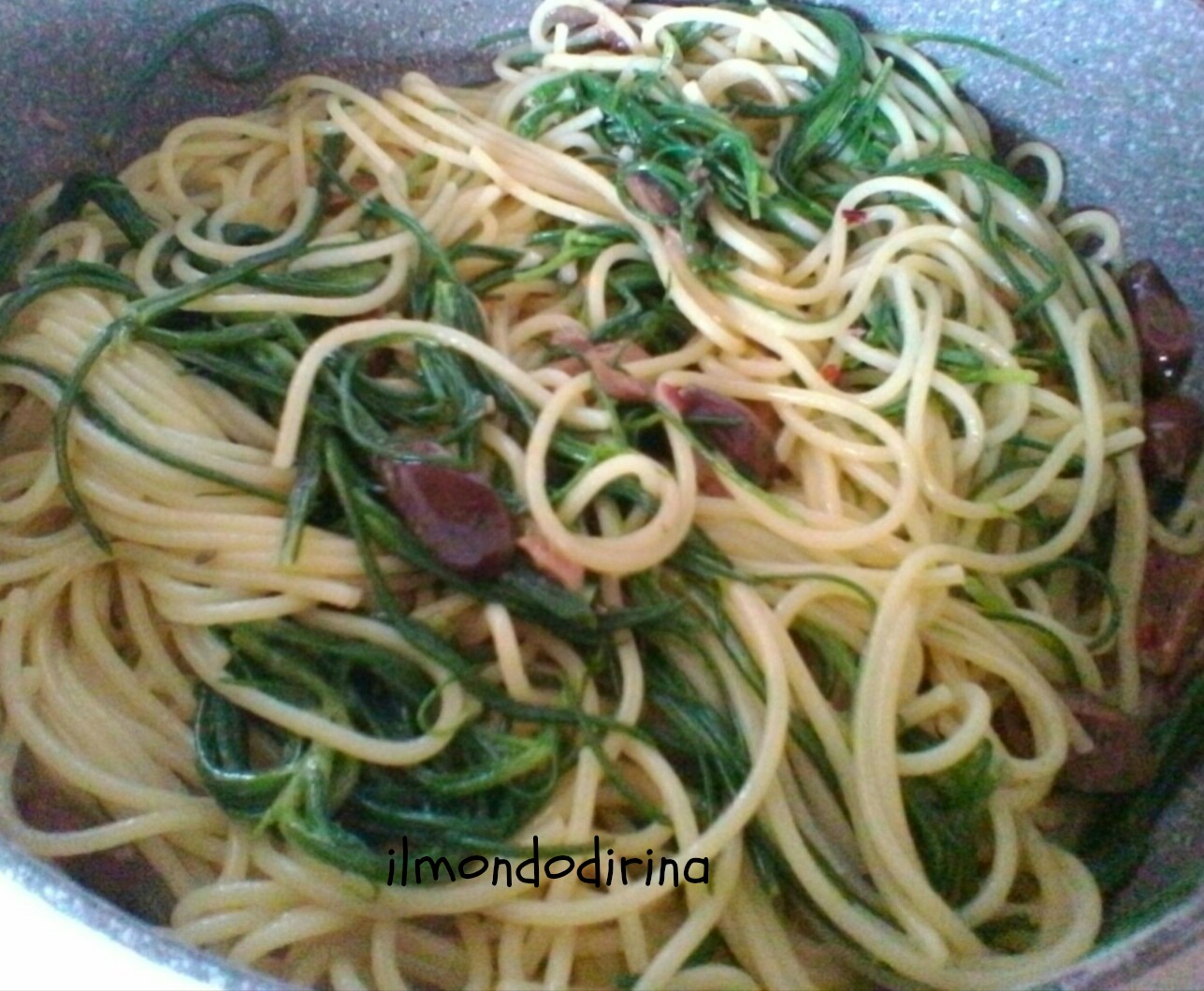 Nel frattempo mettete sul fuoco una pentola con l’acqua e salatela appena inizia a bollire. Versate la verdura insieme agli spaghetti e appena cotti scolateli e versateli nella padella del condimento.