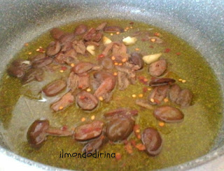 Pulite la barba del frate tagliando la radice e sciacquatela bene sotto l’acqua corrente per eliminare ogni residuo di terra. In una padella versate l’olio evo e aggiungete lo spicchio d’aglio e le acciughe. A fuoco basso fate sciogliere le acciughe, quindi unite le olive tagliate a filetto e del peperoncino tritato. Fate cuocere per cinque minuti.