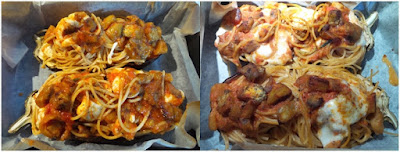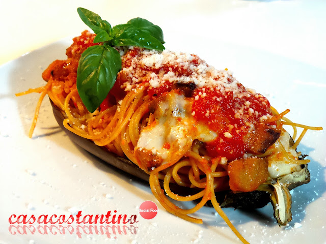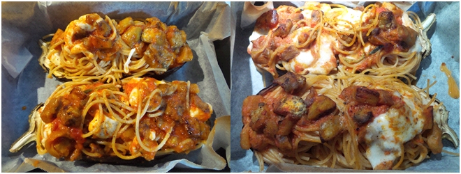 Appena la polpa di melanzana sarà ben dorata, mettiamola da parte. Sforniamo le barchette e scoliamo la pasta. In una boule mettiamo gli spaghetti, i cubetti di melanzana, le mozzarelle tagliate a cubetti e tanta