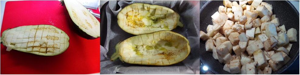 Per preparare le nostre barchette di melanzana alla siciliana, dobbiamo iniziare col tagliare in due le stesse per il senso della lunghezza, quindi inciderle in modo da ricavarne dei cubetti di polpa che terremo da parte ed infine svuotarle. Una volta terminata la fase di preparazione, adagiamo le barchette così ottenute su di una teglia foderata di carta forno, saliamole, pepiamole ed aggiungiamo un filo d’olio quindi inforniamo, a forno preriscaldato a 250°, per 15′. Mentre le barchette cuociono in forno, mettiamo i cubetti di polpa in un padellino con un filo d’olio, sale e pepe e facciamoli saltare per 5′.