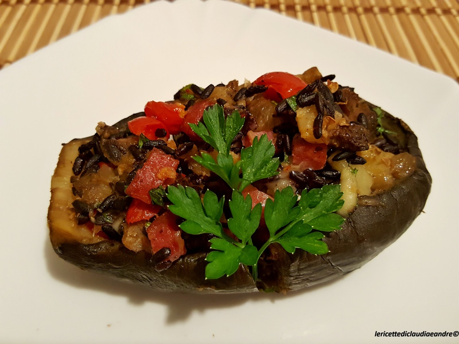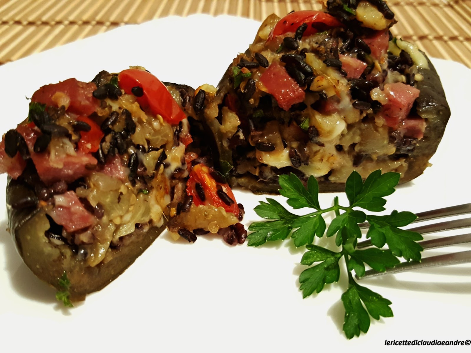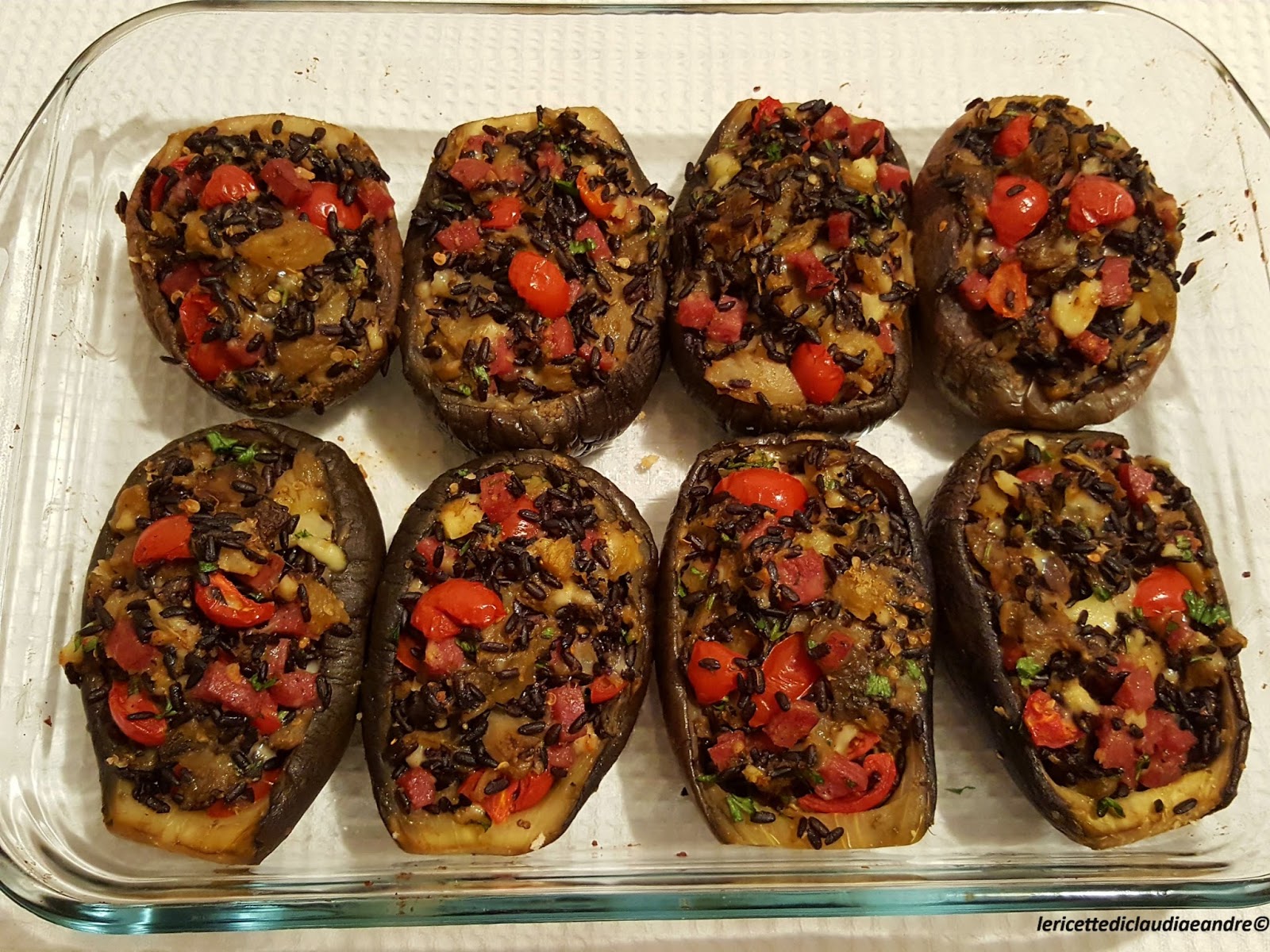 Barchette di melanzane con riso venere, formaggio, salame e pomodorini