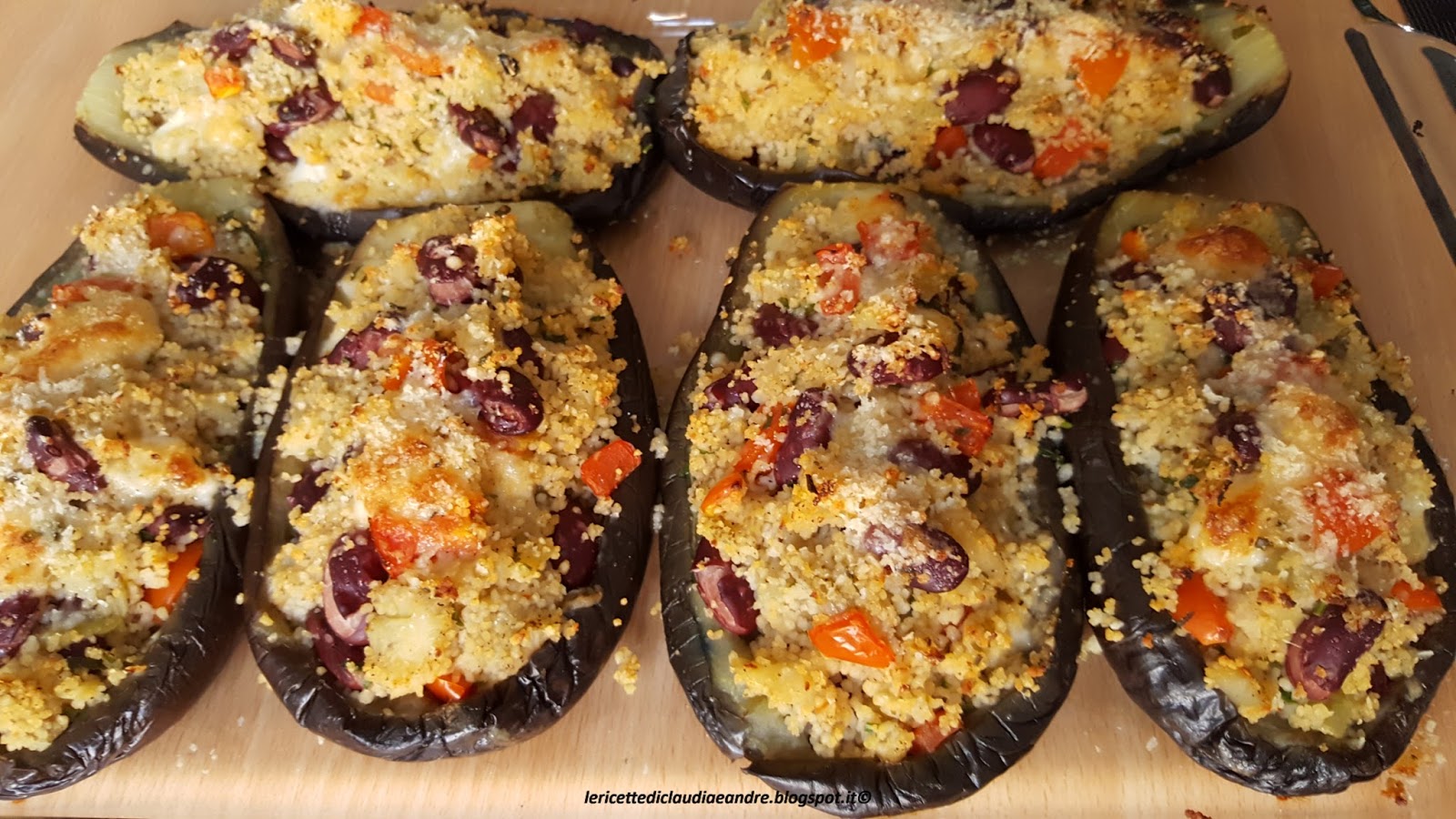 Barchette di melanzane ripiene di cous cous, tonno, asiago e fagioli rossi