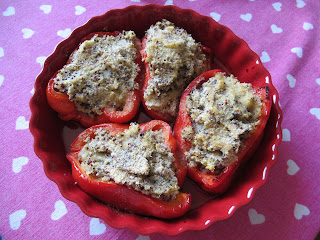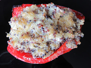 Tagliare in due i peperoni e tenerli in forno per 20 minuti con la funzione “grill”, farli raffreddare e spellarli. Nel frattempo lessare le patate e schiacciarle. Cuocere la quinoa ed unirla alle patate, aggiungere spezie e sale e mescolare. Farcire le 4 barchette e distribuirle su una tortiera. Spolverizzare un po’ di pangrattato e versarvi un po’ d’olio. Infornare a 180° per 20 minuti.