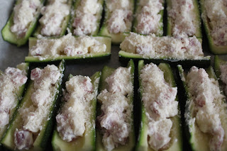 Lavare le zucchine e privarle delle estremità, tagliarle a metà nel senso della lunghezza e poi ancora a metà. Delicatamente togliere l’interno di ogni parte in modo da ottenere delle barchette vuote ( mettere da parte lo scarto per altre preparazioni, io zuppa con carote e patate).