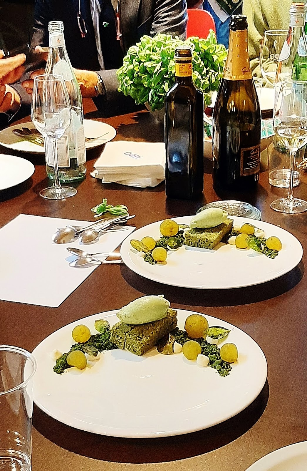 Un dessert anche per per gli chef della Trattoria dell’Acciughetta di Genova, Matteo Rebora e Simone Vesuviano che hanno presentato Basilico on my Mind, Gelato allo Yogurt e Basilico Genovese DOP con Pan di Spagna all’Olio Extravergine di Oliva, Namelaka al Lime e Mela Verde.