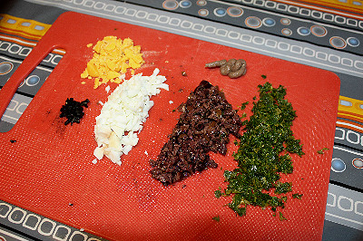 preparate gli ingredienti, sbucciate l’uovo e dividete il tuorlo dall’albume, tritateli finemente a coltello.
